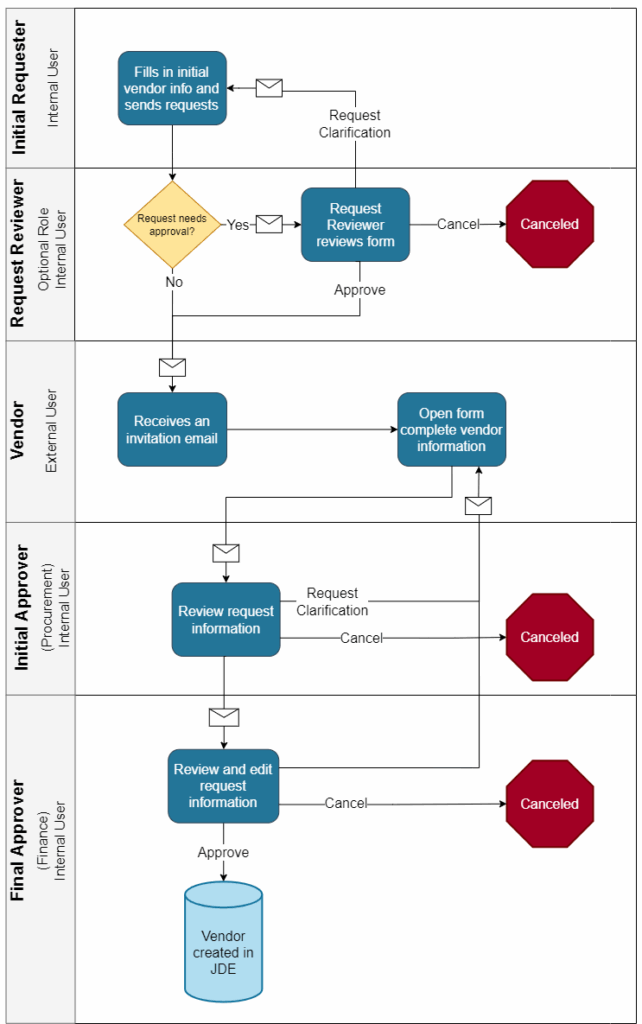 The Vendor Onboarding (VOB) application standardizes and simplifies the setup of new vendors across procurement and finance teams. Built with EASYProcess 5.1 and fully integrated with JD Edwards, the workflow guides requests from initial submission through internal approvals to final vendor creation.